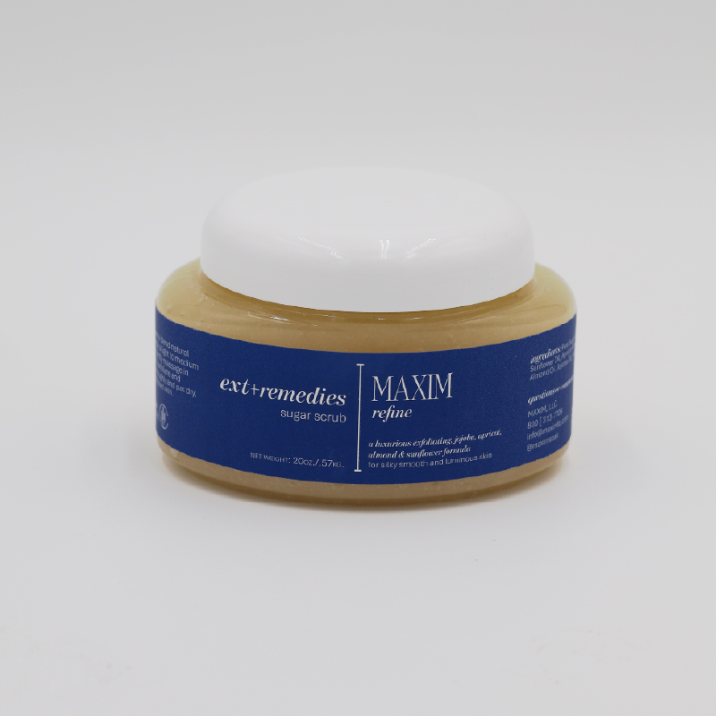 ext+remedies Sugar Scrub | MAXIM Refine is a professional-grade full body exfoliating sugar and salt scrub designed to buff away dryness and refine skin texture. Formulated with jojoba, apricot, almond, and sunflower oils, this weekly exfoliant polishes while supporting the skin’s natural moisture balance. Ideal for hands, feet, and full-body use, MAXIM Refine is trusted by spa professionals and perfect for at-home self-care. Available in 100+ fragrances, including select options infused with essential oils.